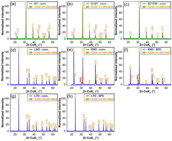 XRD diagrams of sintered ceramics: (a) BT; (b) Zr:BT; (c) BCTZ50; (d) LNO; (e,f) KNO; and (g,h) LTO, sintered conventionally (conv.) (a–e,g) or by (f,h) SPS. The ICDD reference diffraction lines of each targeted phase are presented (in orange colour) alongside the corresponding sample XRD pattern.