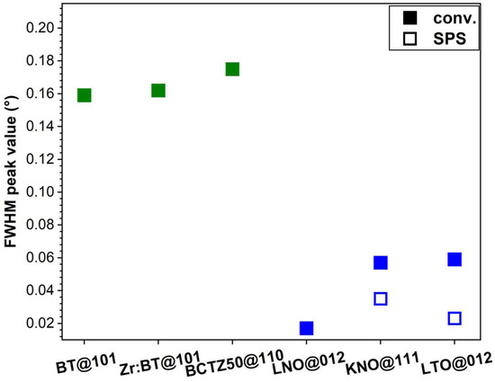 FWHM values of the most intense diffraction peak of each ceramic sample, sintered either conventionally (conv.) (solid symbols) or by SPS (hollow symbols).