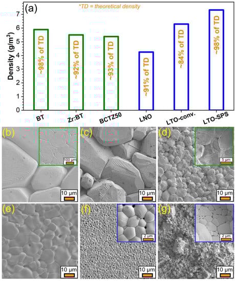 (a) Density values of the sintered piezoceramic materials. FE-SEM morphology of the conventionally sintered (b) BT; (c) Zr:BT; (d) BCTZ50; (e) LNO; and (f) LTO and (g) spark plasma sintered LTO ceramic disks. Insets: FE-SEM images collected at: lower magnification in the case of (b) BT, to enable the visualization of the general morphology of the sintered disks, and at higher magnification for the finer grained materials—(d) BCTZ50; and both (f) conventionally and (g) spark plasma sintered LTO, to disclose the morphology and size of the constituting grains.