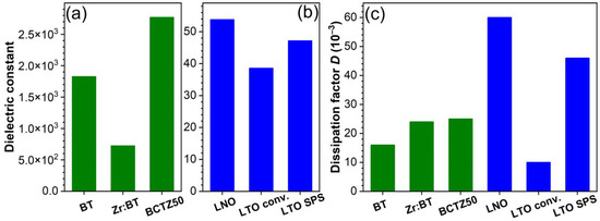 The dielectric properties of the sintered ceramic pellets were evaluated by capacitance and dielectric loss measurements; additionally, the dielectric features were assessed by the subsequent determination of the dielectric constant (ε). The recorded dielectric constant and dielectric loss (dissipation factors) values are presented in Figure 4a–c, respectively. The dielectric constant of BCTZ50 was found to be significantly higher, i.e., by 1.5 and 3 times compared to that of BT and Zr:BT, respectively. This behaviour can be induced by the proximity of the narrow transition between three ferroelectric phases with rhombohedral, orthorhombic and tetragonal crystal symmetries, with a very low energy barrier for the polarization rotation and lattice distortion, from one phase to another, thereby, resulting in the considerable enhancement of the dielectric and piezoelectric properties [49,50,51]. Comparable dielectric losses were delivered by the BT, Zr:BT and BCTZ50 sintered ceramics. The dielectric constants of LNO and LTO (Figure 4b) were substantially lower than those of BT-based materials (i.e., by ~40 times), while their dissipation factors were two or even three times higher than the latter ones (Figure 4c), with the exception of the conventionally sintered LTO specimens. This could be the result of the low grain size (~1–3 µm) (Figure 3f) and an increased concentration of vacancies, typical of SPS processes (employing very short sintering times and lacking an oxygenated atmosphere), which can decrease the dielectric constant (by domain refinement and weakening of the long-range ferroelectric interactions [52,53]) and enhance the electrical conductivity.