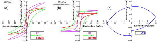 The (a) total and (b) remnant polarization vs. electric field of BT, Zr:BT and BCTZ50. (c) Total polarization vs. electric field in the case of LNO.