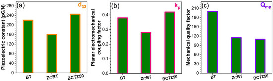 (a) Longitudinal piezoelectric constant d33; (b) planar coupling factor kp; and (c) mechanical quality factor Qmp of the BT, Zr:BT-Zr and BCTZ50 sintered ceramics.