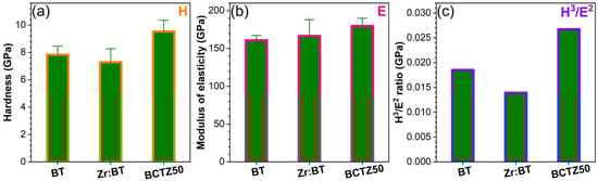 (a) Hardness; (b) modulus of elasticity; and (c) H3/E2 ratio (“plastic index”) determined for the BT, Zr:BT and BCTZ50 sintered ceramics based on indentation tests.