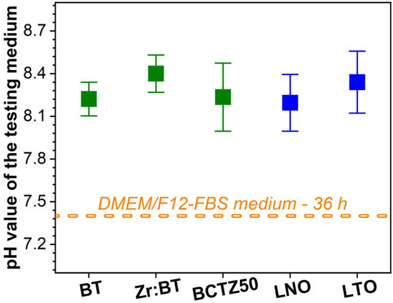 pH value of the DMEM/F12-FBS cell culture medium after 36 h of incubation in the presence of BT, Zr:BT, BCTZ50, LNO and LTO sintered ceramics.