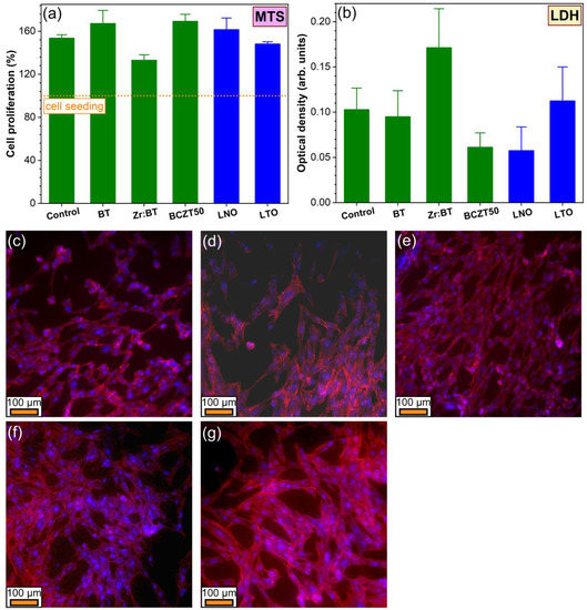 (a) hFOB 1.19 cell proliferation of the sintered ceramics, as assessed by an MTS assay performed after 36 h of culturing; (b) cytotoxicity of the investigated piezoceramics, as inferred by an LDH test after 36 h of culturing; (c–g) morphology of hFOB 1.19 cells after 36 h of culturing on the surface of the (c) BT; (d) Zr:BT; (e) BCTZ50; (f) LNO; and (g) LTO disks, as evidenced by epifluorescence microscopy. The actin cytoskeleton is stained with red (Alexa Fluor™ 546 phalloidin), whilst the cell nuclei are counterstained with blue (DAPI).