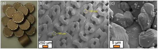 (a) Batch of sintered BCTZ50 scaffolds printed by robocasting. (b) General view of the filament arrangement and size, as evidenced by a low magnification FE-SEM image of a BCTZ50 scaffold fractured along its height. (c) Micro-structure of the sintered BCTZ50 filaments, as revealed by high-magnification FE-SEM analysis.