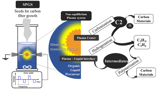 Solution plasma (SP) is an emerging method for the synthesis of a variety of products, such as metal oxides, metal nanoparticles, and carbon materials with different structures [23,24,25,26]. By utilizing organic precursors, it is possible to synthesize carbon materials simply and continuously at room temperature and atmospheric pressure. A nonequilibrium system emerges due to the big temperature gradient between the center of the plasma and the surrounding liquid. In the SP system, there are two reaction pathways for the synthesis of carbon materials, one taking place at the center of the plasma and the other at the interface between the plasma and the liquid (plasma–liquid interface) [27]. The plasma–liquid interface hosts different reactions compared to the center of the plasma as seen in Figure 1. At the center, molecules are thermally degraded due to the high temperature (4000 K) and C2 species, and hydrogen and carbonized particles are released. At the plasma–liquid interface, there is a continuous flow of electrons in order to keep the plasma state, and secondary electrons are taken from the electrodes and liquid surroundings. When these secondary electrons are emitted, radical cations form in the solution. Radicals have a great reactivity and react with the surroundings via the radical polymerization process, and carbon materials are produced.