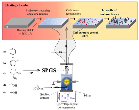 Figure 2 shows the experimental setup for carbon fiber growth using SPGS from different liquid precursors. A total of 80 mL of cold benzene (99.0% purity), o-dichlorobenzene (99.0% purity) (hereafter referred to as dichlorobenzene), NMP (99.0% purity), ethanol (99.0% purity), or methanol (99.0% purity), all purchased from Kanto Chemical Co. Inc, Tokyo, Japan, were loaded in the SP reactor. All solutions were kept at 0 °C (7 °C for benzene) for 2 h before being loaded into the SP reactor. After loading the solution, the air was purged by Ar bubbling at 30 sccm. As soon as the plasma discharge started, the gas dispenser valve was opened to allow the SPGS to enter the plug flow reactor. SPGS was carried with Ar gas that flowed at 30 sccm. In order to keep the gas flow rate constant at 60 sccm, the Ar gas that flowed inside the plug flow reactor was stopped and exchanged with the SPGS carried by Ar gas (from the SP system). The plasma discharge was generated between the two electrodes using a high-voltage bipolar pulse generator (Pekuris AC-MV85-0002) using a voltage of 5 kV, frequency of 20 kHz, and pulse width of 1.0 µs. The plasma was kept constant for 15 min, and the solution temperature was monitored every 3 min, reaching a maximum of 40 ± 3 °C. After the reaction time, the plasma was stopped, and the H2 gas flow was stopped and exchanged for Ar at 60 sccm for cooling down to room temperature. Finally, the sample was collected, and the grown carbon fibers were sonicated from the substrate in acetone for 5 min.
