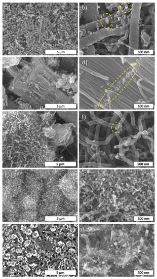 Figure 3 shows SEM images of various fibers prepared from different precursors grown on a Ni substrate at 400 °C. Figure 3a,b belong to fibers synthesized by benzene SPGS. Thick fibers, thin fibers, and amorphous carbon were formed simultaneously. The thickness of the fibers was between 150 and 220 nm, and their nonsmooth surface is characterized by the presence of bumps and grooves. Meanwhile, the surface of thinner fibers with diameters between 40 and 150 nm was quite smooth. In addition, Ni joints were observed as part of the fiber framework. Figure 3c,d present fibers grown by dichlorobenzene SPGS. Numerous fibers with diameters between 90 and 140 nm composed the bundle structure. Another remarkable characteristic is the metallic segmentation (brighter line perpendicular to the fiber axis) that indicates simultaneous columnar growth of the individual fibers. Worm-like fibers grown by NMP SPGS are shown in Figure 3e,f. This sample had diameters between 80 and 114 nm, and some fibers show a groove parallel to the fiber axis that might indicate irregular seed shapes and a turbulent growth. This growth type was considered a “fishbone” type of growth. Moreover, Ni particles were located at the tips of the fibers. Figure 3g,h exhibit entangled fibers with diameters of 38 nm and less fabricated by ethanol SPGS. Lastly, fibers grown by methanol SPGS formed “flower-like” clusters as in Figure 3i,j. Such clusters are comprised of thicker fibers of 72–76 nm in diameter and smaller and shorter fibers (around 20 nm in diameter). The particular shapes found and captured in SEM micrographs for different SPGS-grown fibers belong to repeatable findings using the same precursor. This means that fiber bundles, for example, grown by dichlorobenzene SPGS, cannot be found in samples using a different precursor. Nevertheless, an amorphous phase is present in all the samples.