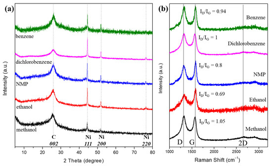 Figure 4a shows the XRD patterns of the synthesized carbon fibers grown by SPGS using different liquid precursors. The XRD patterns of all carbon fibers show a characteristic broad and sharp peak around 25.9° corresponding to the 002 plane of turbostratic graphite. The broadness of the peaks indicates the presence of small crystallites and amorphous structures. Ni forms part of the structure of the carbon fibers, and the sharp peaks around 44.5°, 51.9°, and 76.5° correspond to the 111, 200, and 220 crystallographic planes of Ni, respectively. In the case of carbon fibers grown by dichlorobenzene, the Ni peaks were sharper, which might indicate a significant metal content.