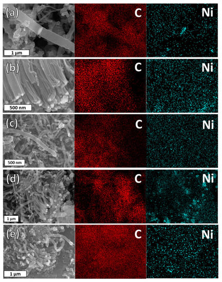 The position of Ni in the carbon fiber structure was confirmed by energy-dispersive X-ray spectroscopy (EDX) in Figure 5. In the images, Ni was positioned at the tip and joint positions of the fiber structure. In general, Ni plays an important role in the growth of carbon fibers by providing a catalytic nucleus. Although the overall morphology was different depending on the precursor, all carbon fibers were formed according to the tip-growth mechanism by Ni as a catalyst [12,20]. As reported by Bartholomew C. in 1982 [29], in a temperature range between 200 and 500 °C, different carbon formations overlap on Ni, including carbides, amorphous carbon, and fibrous carbon. As seen in the micrographs in Figure 5, Ni was detected not only in the tips of the fibers but also in the centers of the fibers. The size of the Ni particles that were detached from the substrate also determines the diameter of the fiber, as can be seen in Figure S1 (Supplementary Materials).