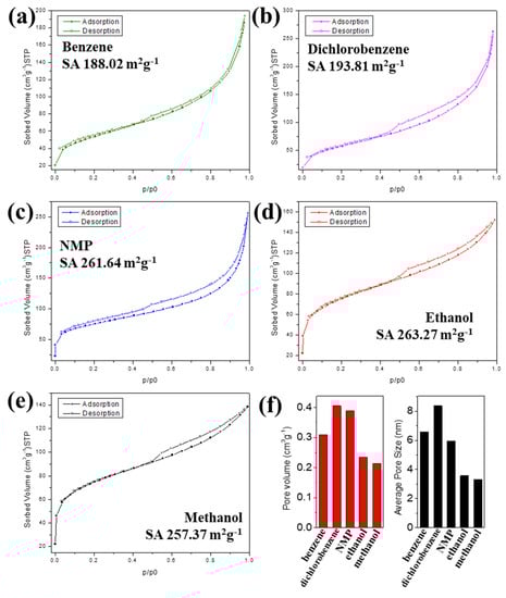 Nitrogen adsorption–desorption isotherms of carbon fibers grown by (a) benzene, (b) dichlorobenzene, (c) NMP, (d) ethanol, and (e) methanol SPGS at 77 K. (f) Pore volume and average pore size.