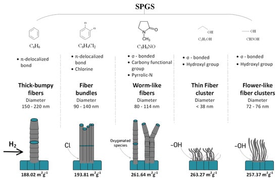 SP has the advantage of using different liquid precursors that would provide certain characteristics to the final product, mostly in terms of functionality. Nevertheless, morphology is difficult to control in this system. By using SPGS in combination with a plug flow reactor, it is possible to grow carbon fibers that have peculiar morphologies and textural properties. The precursor plays an important role in determining the morphological features of the SPGS-grown fibers owing to the different functional groups present in the molecular structure. Figure 7 shows the carbon fiber morphological peculiarities that depend on the precursor.