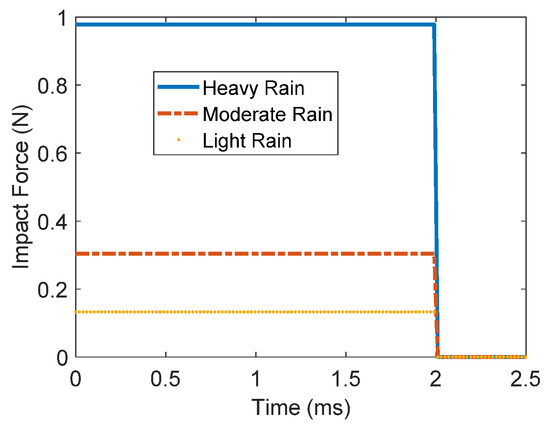 Rainfall droplet’s impact force profile of light, moderate, and heavy rain types.
