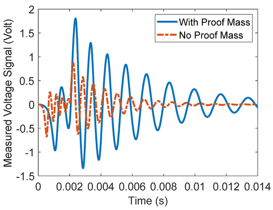 Voltage signal output by the proposed sensing device with and without proof mass.