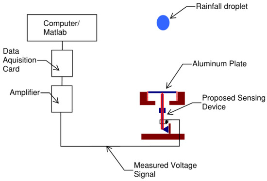 A future experiment is highly suggested to validate the analytical model. The measured voltage signal is due to the collision of the rainfall droplet with the aluminum plate. The plate area must be big enough to make sure that the whole collision process occurs on the plate and must be light enough to not affect the recorded measurements. The measured voltage signal can be amplified using an amplifier. The amplified voltage signal can be transferred to a personal computer via a high-accuracy data acquisition board for further analysis. The measured and amplified voltage can be analyzed by MATLAB using the corresponding analytical model to obtain the impact forces by numerically solving the differential Equations (14) and (15). Figure 7 shows a mock-up schematic diagram for the proposed future experimental setup.