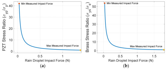 It is very important to determine the range of the impact forces the rainfall sensing device can measure. The proposed sensing device’s maximum measuring resolution is determined by the maximum impact force it can measure before it breaks due to the excessive axial stress on the substructure and/or piezoelectric layers. The normal stress in the substructure and PZT layers can be calculated from (17). The ratio of the maximum yield stress to the normal stress of the substructure and PZT layers are denoted by and , respectively. This ratio must be larger than unity so that the proposed sensing device does not break under the influence of excessive rainfall impact force. Furthermore, the minimum measuring resolution of the proposed sensing device is determined when the measured impact force equals the first buckling load of the device. Figure 8 shows the minimum and maximum impact forces that can be measured by the proposed sensing device. The sensing device resolution is determined by the maximum allowed yield stress ratio of the PZT layer and the substructure as indicated in Figure 8a,b, respectively. It can be seen that the minimum impact force that can be measured is the same for both substructure and PZT layers and equals . The maximum measured impact force is dominated and determined by the allowable yield stress ratio of the PZT layers and equals . This is because PZT layers have less structural strength when compared to brass. In summary, the sensing device impact force measuring sensitivity is between and the proposed sensing device is subject to mechanical failure if the impact force is larger than the upper bound of the measuring sensitivity. Furthermore, no voltage signal can be measured if the impact force is less than the lower bound of the device impact force measuring sensitivity.