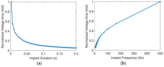 At this point, it is necessary to illustrate the general effect of the amount of the impact force and its frequency (impact duration) on the voltage signal. A large amount of impact force will increase the amplitude of the free oscillations of the beam and thus increases the amplitude of the voltage signal, as can be seen in Figure 5. Furthermore, if the duration of the impact force increases (low frequency), the vibration amplitude decreases, and consequently the peak of the voltage signal decreases. The variation of the voltage signal amplitude with the impact duration can be seen in Figure 9a, which ranges from to . In Figure 9b, the impact frequency that corresponds with the impact duration is illustrated and ranges from 5 Hz to . Therefore, the best voltage signal is achieved when there is a high frequency (low impact duration) and a high amount of impact force. Our proposed sensing device is optimized for an impact duration of . Therefore, it must be noted that at a different impact duration, the GA optimization discussed previously must be repeated to achieve the optimum performance, the optimal design variables, and the resulting natural frequency of the proposed sensing device.
