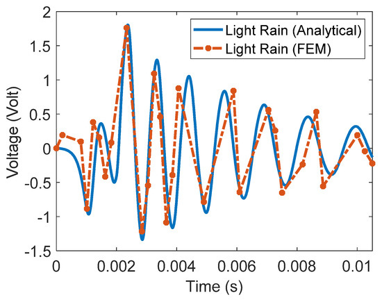 To further verify the analytical model, the measured voltage signal obtained analytically is verified numerically using COMSOL 6.0 software. Figure 11 illustrates the time-domain response of the measured voltage signal due to the impact force of the light rainfall droplet for both models, the analytical and the FE models, respectively. It can be concluded from the figure that both models are in good agreement with each other. Nevertheless, the deviation between the analytical and FEM results can be justified, as part of the high nonlinear behavior of the analytical model could not be captured and properly simulated by the proposed FE model. Furthermore, when very small physical dimensions are involved, as is the case here, FEM model convergence can be affected significantly.