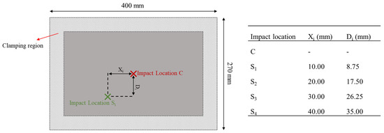 Low-velocity impact tests were performed on coupon level samples (dimensions: 150 mm × 100 mm) according to ASTM D7136 [38]. Laminates with 24 plies (thickness: 4.8 mm) were manufactured with [45/0/−45/90]3s layup and tested at impact energies of 8 J, 10 J, and 12 J with a drop weight equipment using a hemispherical impactor (diameter: 16 mm). The force–time histories were recorded using a load cell (Kistler 9331B, Winterthur, Switzerland), an amplifier (Kistler 5011B, Winterthur, Switzerland), and NI 9239 data acquisition system (National Instruments Corp, Austin, TX, USA). Besides, skin panels (dimensions: 400 mm × 270 mm × 3.42 mm) produced with 18 plies and a stacking sequence of [±45/0/±45/∓45/90/0]S were impacted first at the center, with an energy of 35 J or 40 J, followed by off-central impacts, with an impact energy of 25 J. Each of these panels experienced up to two low-velocity impacts at different locations according to Figure 1.