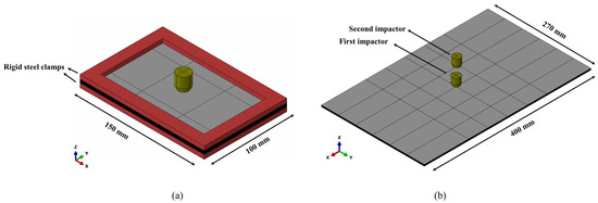 The FE models: (a) Impact on coupon specimen, (b) Multiple impacts on skin panel.