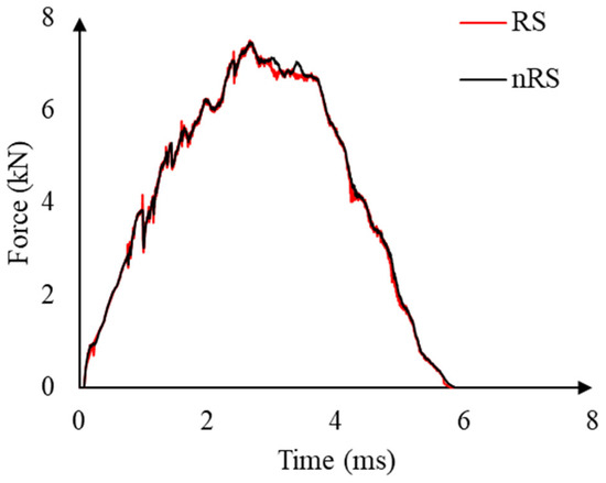 Comparison of force–time curves for the panel subjected to multiple impacts from simulations with the rest step (RS) and without the rest step (nRS).