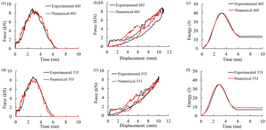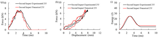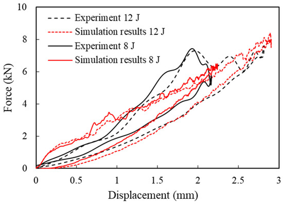 The experimental and numerical curves force–displacement curves for the 8 J and 12 J impacts are compared in Figure 4. The numerical model provided accurate predictions of peak force, absorbed energy, peak displacement, and impact time duration.