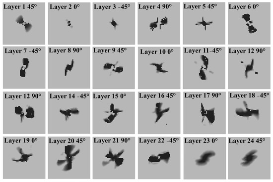 Layer-by-layer prediction of the matrix damage area, layer 1 being the impact side and layer 24 being the rear side of the specimen.