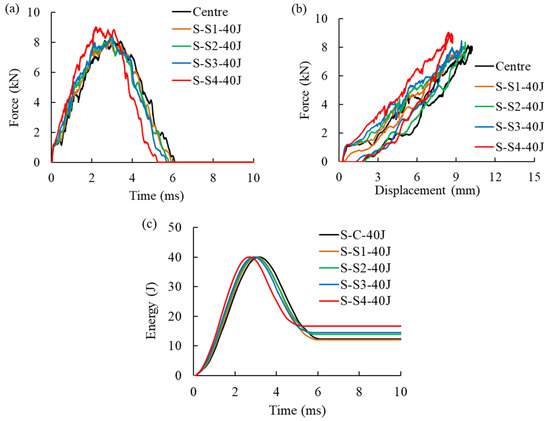 Comparison of force–time (a), displacement–time (b), and energy–time (c) curves for 40 J impact at the center and off-center locations.