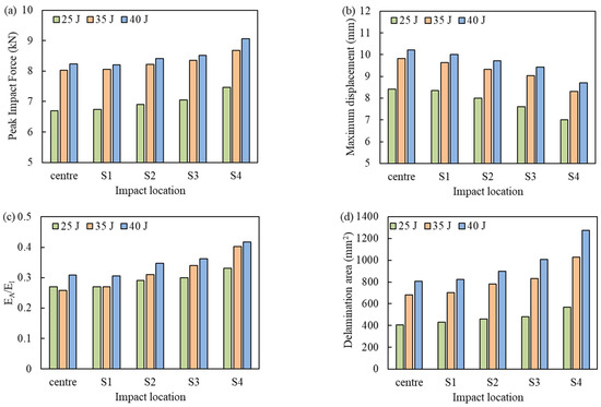 Figure 8a–d summarizes the response parameters for all locations. The ratio of absorbed energy to impact energy is higher for off-center locations, which is consistent with the increase in the projected delamination area (Figure 8d). This has also been observed in the experimental findings of [35]. Furthermore, for the 35 J impact, the absorbed energy for the central impact was 9.02 J, which increased by 49% to 14.09 J for the off-center impact at S4 location. Accordingly, a 33.7% increase in the delamination area was observed (Figure 8d).