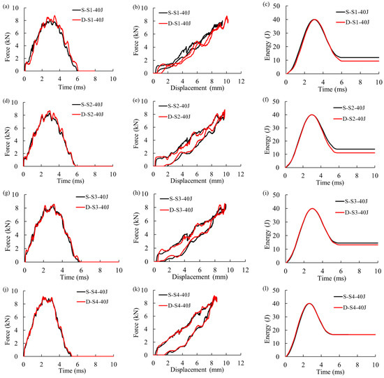 Comparison of force–time, displacement–time, and energy–time curves between a single and a double 40 J low-velocity impact at: (a–c) S1, (d–f) S2, (g–i) S3, and (j–l) S4.