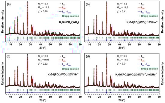 Rietveld refinement of undoped K2Gd(PO4)(WO4) (a), K2Gd(PO4)(WO4):10%Ho3+ (b), K2Gd(PO4)(WO4):20%Yb3+ (c), and K2Gd(PO4)(WO4):20%Yb3+,10%Ho3+ (d) XRD patterns.