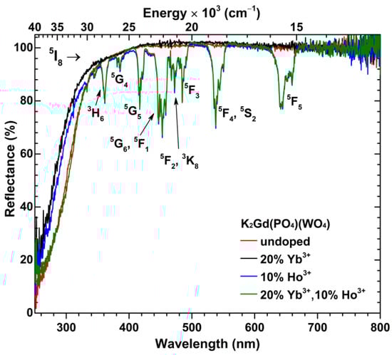 The body color of the undoped K2Gd(PO4)(WO4) and 20% Yb3+ doped samples was white, indicating that both compounds do not absorb in the visible spectrum range. The Ho3+ doped samples, in turn, possessed a yellowish body color under sunlight and the reddish body color under fluorescent lamp (FL) illumination. The yellowish body color is caused by many strong absorption lines of Ho3+ in the visible spectrum, whereas the reddish body color is a result of Ho3+ excitation by the fluorescent lamp leading to red emission. The reflection spectra of undoped, 20% Yb3+ doped, and 10% Ho3+ doped, together with 20% Yb3+ and 10%Ho3+ co-doped samples are shown in Figure 2. The reflectance spectra were measured in a 250–800 nm range. The reflectance spectra of Ho3+ doped samples possess several sets of absorption lines typical to Ho3+, i.e., 5I8 → 3H6 (ca. 355–368 nm), 5I8 → 5G4 (ca. 380–390 nm), 5I8 → 5G5 (ca. 410–426 nm), 5I8 → 5G6;5F1 (ca. 440–464 nm), 5I8 → 5F2;3K8 (ca. 466–480 nm), 5I8 → 5F3 (ca. 483 nm), 5I8 → 5F4;5S2 (ca. 525–555 nm), and 5I8 → 5F5 (ca. 624–665 nm). The broad absorption band in the UV range (around 300 nm) can be assigned to the O2− → W6+ charge transfer transition in the host lattice [37].