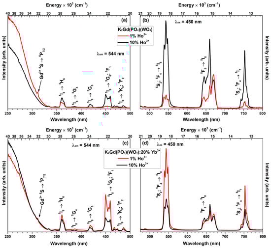 The excitation (λem = 544 nm) spectra of K2Gd(PO4)(WO4):Ho3+ and K2Gd(PO4)(WO4):20%Yb3+,Ho3+ (where the Ho3+ concentration is 1% and 10%) samples were measured in the 250–500 nm range and are depicted in Figure 3a,c, respectively. The measured spectra consist of several sets of excitation lines which originated from the typical Ho3+ ground state (5I8) transitions to 3H6 (ca. 355–368 nm), 5G4 (ca. 380–390 nm), 5G5 (ca. 410–426 nm), 5G6 + 5F1 (ca. 440–464 nm), and 3K8 + 5F2 (ca. 466–480 nm) [38,39]. The highest excitation line intensity for solely Ho3+ doped samples was observed for the 10% doped sample. Moreover, a weak excitation line attributed to the 8S → 6P7/2 (ca. 311 nm) transition of Gd3+ [40] is also visible in the excitation spectra. This indicates that some Gd3+ → Ho3+ energy transfer occurs in the given host matrix. The same Gd3+ line was also observed in the K2Gd(PO4)(WO4):20%Yb3+,Ho3+ excitation spectra. Besides, the strongest Ho3+ excitation line intensity for Yb3+-containing samples was observed when the Ho3+ concentration was fixed at 1%. The broad excitation band in the range of 250–330 nm is attributed to the O2– to W6+ charge-transfer transition within the WO42−. Such transitions are typical for the tungstate compounds in this spectral range and reported by many authors [41,42].