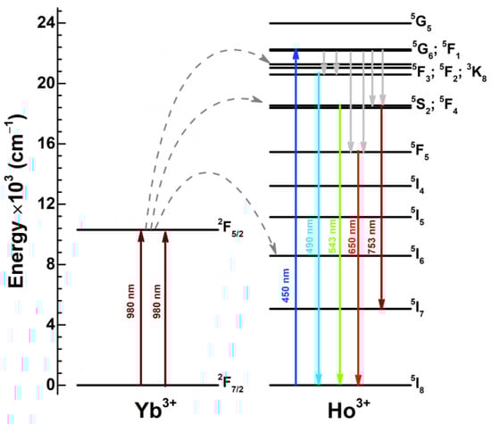 The schematic energy level diagram with the main Yb3+ and Ho3+ transitions is depicted in Figure 4. Samples containing Ho3+ could be directly excited to 5G6; 5F1 energy levels with the 450 nm excitation radiation (blue arrow). After relaxation to the lower-lying energy levels, emission in the cyan, green, red, and deep red spectral regions occurs. If the Ho3+ doped sample also contains Yb3+, the sample can be excited with the NIR radiation via the Yb3+ → Ho3+ energy transfer.