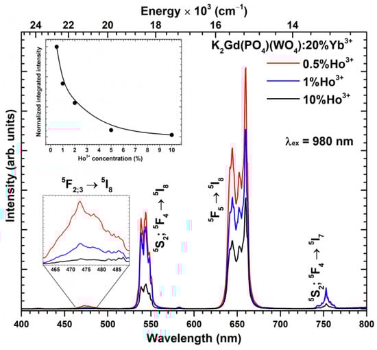 Up-conversion emission spectra (λex = 980 nm) of K2Gd(PO4)(WO4):20%Yb3+,Ho3+ and normalized integrated emissions as a function of Ho3+ concentration are depicted in Figure 5. As shown in Figure 1, Ho3+ does not have energy levels that could be directly excited with the 980 nm laser radiation; therefore, in this case, Yb3+ absorbs the laser radiation and transfers the energy to Ho3+. The measured Ho3+ up-conversion spectra are very similar to those when Ho3+ was directly excited with blue radiation (please refer to Figure 4). Typical Ho3+ emission lines were observed in up-conversion spectra measured in the 400–800 nm range, i.e., 5F2;3 → 5I8 (ca. 460–488 nm), 5S2;5F4 → 5I8 (ca. 530–555 nm), 5F5 → 5I8 (ca. 630–670 nm), and 5S2;5F4 → 5I7 (ca. 740–765 nm). The most intensive emission lines were observed for the 5F5 → 5I8 transition in the red spectral region. The highest up-conversion emission intensity was observed for the sample doped with 0.5% Ho3+. The up-conversion emission intensity decreases with further increasing the Ho3+ concentration. The normalized integrated emission of the samples (please refer to the inset in Figure 5) confirms that the total up-conversion emission intensity drastically decreases with increasing Ho3+ concentrations. The up-conversion emission intensity decrease with increasing Ho3+ concentration is caused by the increasing probability of Ho3+ → Yb3+ energy transfer, as discussed above. The digital images of K2Gd(PO4)(WO4):20%Yb3+,Ho3+ up-conversion luminescence (λex = 980 nm laser) as a function of Ho3+ concentration are given in Figure S2.