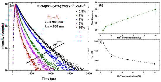In order to better understand the up-conversion process of the prepared materials, the PL decay curves (λex = 980 nm, λem = 660 nm) of the most intensive emission peak (5F5 → 5I8 transition) were measured. The recorded UC PL decay curves of K2Gd(PO4)(WO4):20%Yb3+,Ho3+ samples as a function of Ho3+ concentration are shown in Figure 6a–c, in turn, show the calculated PL rise time and τeff values of the same samples, respectively. The PL decay curves become steeper with increasing Ho3+ concentration, indicating that PL lifetime values decrease. This indeed is true since the calculated τeff values decreased from 191 μs for 0.5% Ho3+ doped samples to 83 μs for 10% Ho3+ doped samples (please refer to Figure 6c). The opposite tendency, however, was observed for the PL rise time values, which increased with increasing Ho3+ concentration. The exact calculated PL rise time and lifetime values, together with standard deviations, are summarized in Table S6. The calculated UC PL lifetime values for 5F5 → 5I8 transition are very similar to the ones reported by other authors in a wide variety of materials, i.e., oxides, phosphates, titanates, silicates, tungsten tellurite glasses, and even fluorides. For instance, Guo et al. reported that the UC PL lifetime value of BaGdF5:20%Yb3+,1%Ho3+ is around 131 μs [28] which is close to the 122 μs for our K2Gd(PO4)(WO4):20%Yb3+,2%Ho3+ sample. Rather similar UC PL lifetimes were also observed in Sr3Y(PO4)3:10%Yb3+,2%Ho3+ (261 μs) and BaTiO3:3%Yb3+,0.2%Ho3+ (155 μs for cubic phase and 125 μs for tetragonal phase) compounds which were reported by Liu et al. [48] and Mahata et al. [11], respectively. However, there are also host matrixes where Ho3+ UC PL lifetimes are much shorter, for instance, La9.31(Si1.04O4)6O2:20%Yb3+,1%Ho3+ (around 18 μs) [49] and tungsten–tellurite glass (around 33 μs) [50]. An overview of these materials is given in Table 1.