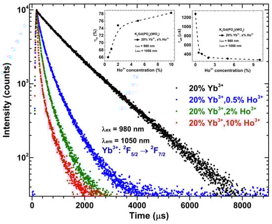 In order to evaluate the PL lifetime values of Yb3+ in the prepared samples, the PL curves under the 980 nm laser excitation were recorded by monitoring emission at 1050 nm. The obtained PL decay curves are depicted in Figure 7. The PL lifetime values of Yb3+ 2F5/2 → 2F7/2 transition drastically decrease from 1279 ± 23 μs to 278 ± 6 μs with increasing Ho3+ concentration from 0% to 10%; the tendency and exact values are represented in Figure 7 inset and Table S7. Such an abrupt decrease of Yb3+ PL lifetime with increasing Ho3+ concentration is related to the Yb3+ → Ho3+ energy transfer. The energy transfer efficiency (ηtr) was calculated from the Yb3+ PL lifetime values by the following formula [51]: