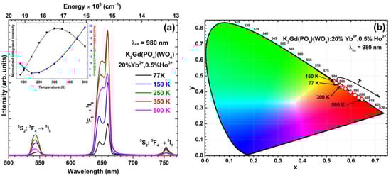 The temperature-dependent up-conversion emission spectra were recorded in the 77–500 K temperature range to evaluate samples’ performance at high temperatures. The temperature-dependent up-conversion emission (λex = 980 nm) spectra of K2Gd(PO4)(WO4):20%Yb3+,0.5%Ho3+ sample along with normalized integrated emission and red/green emission ratio are presented in Figure 8a. Ho3+ emission increases with increasing temperature from 77 to 350 K and then decreases with further temperature increases. However, it should be noted that the integrated UC emission intensity at 500 K is around four times higher than the emission at 77 K. The normalized integrated UC emission intensity reaches a maximum of around 300 K and then decreases. The red/green emission ratio decreases in the temperature range from 77 to 150 K and increases with further temperature increase. This shows that the green emission is quenched faster with increasing temperature compared to the red emission. Such temperature-dependent UC emission spectra feature could be used for luminescent temperature sensing. Moreover, the red/green ratio change is also reflected by a color change from orange-red (at 77 K) to orange (at 300 K) and then to a deep-red region with a further temperature increase to 500 K. The color point shifting could be observed in the CIE1931 color space diagram. All the calculated color points are near the edge of the CIE1931 color space diagram, showing the high color purity of the prepared samples. The exact calculated color coordinates of the prepared samples are tabulated in Table S8.