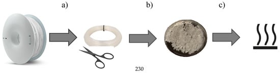 The filament moisture was measured on a RADWAG (Radom, Poland) balance dryer, type MA50/1.R, from filament samples with a length of about 10 mm (weight ca. 10 g). A diagram of the filament moisture test process is shown in Figure 2. The drying temperature was set to 80 °C, while the drying time was set to 90 min. [40].