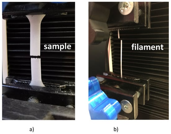 The strength tests of the filament and the printed samples: (a) strength tests of printed samples, (b) strength tests of the filament with a diameter of 1.75 mm.