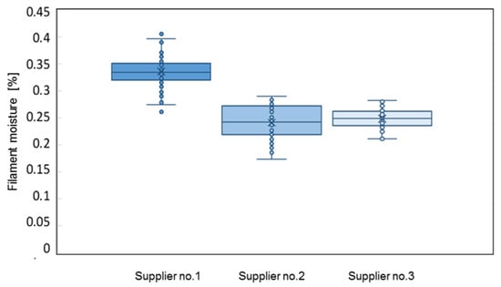 The moisture contents of ABS commercial filaments purchased from three suppliers were tested. The filaments from all manufacturers were delivered on spools in the original packaging. The moisture test was performed immediately after opening a package, at an ambient humidity of 52–54%. The measurement results are shown in Figure 4.