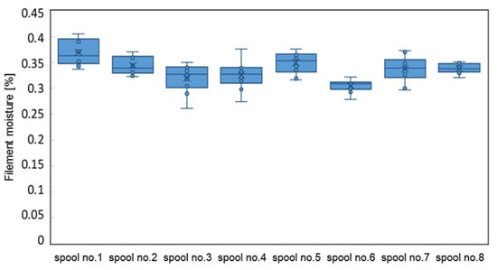 The moisture measurement was carried out on filaments taken from six different spools from one supplier, immediately after opening the package. Samples for the moisture testing were taken from various places on the spool (top, middle, and inner layers). The obtained results are shown in Figure 5.