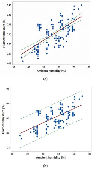 Filament from all manufacturers was stored in spools and bundles in an environment with an ambient humidity of 35–75%. The air temperature changed during this period in the range of 21–23 °C and had an air pressure of 990–1020 hPa. The moisture measurements were carried out on 150 samples. The results are shown in Figure 6 in the form of a scatter plot, as well as a regression line and confidence interval for the mean (a) and for a single observation (b).