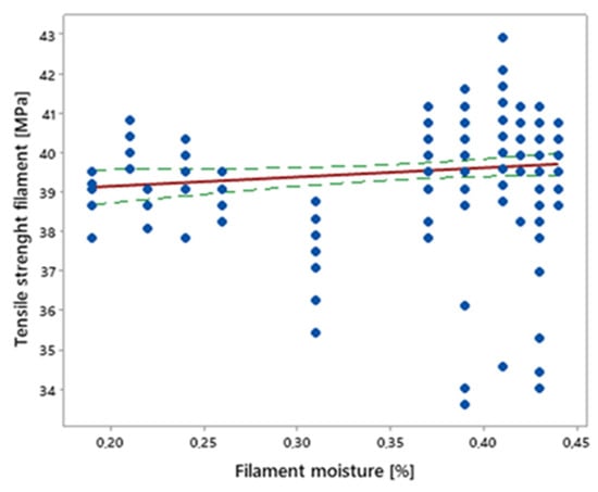 Influence of filament moisture on its tensile strength (red—regression line, green—confidence interval; confidence level = 0.95.
