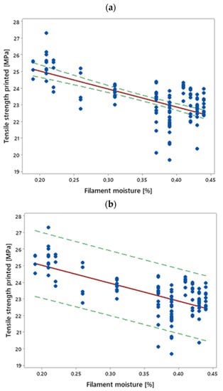 and the correlation coefficient, r = −0.67, was quite low [42]. However, the dependence was significant from a practical point of view. It can be estimated that a change in the moisture of the filament by 0.1 percentage point caused a reduction in tensile strength by 1.08 MPa. Given Equation (2), it can be concluded that a change in the ambient humidity from 10 percentage points caused a reduction in the tensile strength of the sample by about 0.54 MPa.