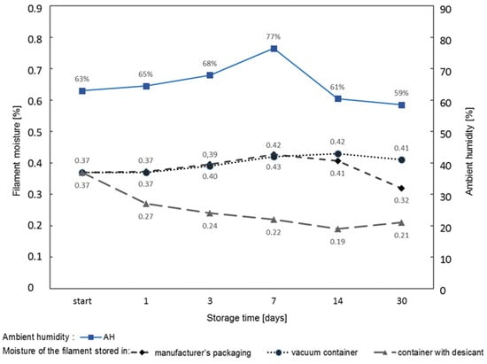 The results of the measurements are shown in Figure 10. In each case, the starting filament moisture was 0.37%. The research was carried out over a period of 30 days. During this period, the ambient humidity was 59–77%. Analysis of the chart in Figure 10 shows:
