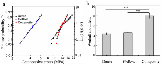 - The porous β-TCP/PCL composite scaffolds also showed excellent reliability. The Weibull modulus of the composite scaffolds reached 8.01 ± 0.49, which was ~1.7 times higher than that of both dense and hollow scaffolds. The Weibull modulus of the composite scaffolds was comparable to that of natural bone due to polymer reinforcement and toughening.