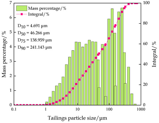 Classified fine tailings were selected for the experiment, and the experimental material was derived from the ore tailing of a gold mine in Shandong Province, China. The classified fine tailings are dried before configuring the filling slurry. The physical parameters are presented in Table 1, and the main chemical components are listed in Table 2. The grain size is shown in Figure 1. The content of 0–45 µm tailings is approximately 50%, and the content of tailings with sizes less than 300 µm, which are considered fine-grained tailings, is approximately 95%. As shown in Figure 2, the composition of tailings is relatively simple, mainly composed of quartz, feldspar, zeolite, and calcite. The classified fine tailings, which are mainly composed of SiO2 and Al2O3, are a good inert filling material suitable for downhole filling raw materials.