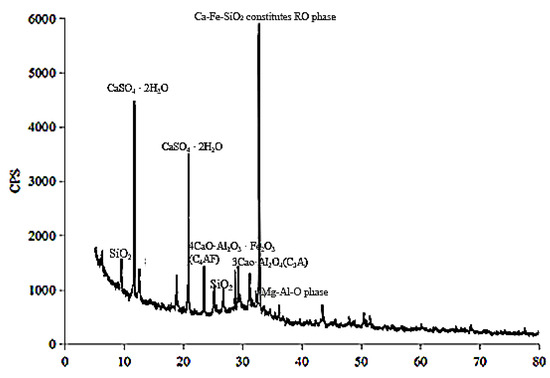 Cementitious material, “filling C material”, which was independently developed by a laboratory, was used in this experiment. The mineral composition of the material is mainly slag and gypsum. The chemical composition of the filling C material is shown in Table 3, and its chemical composition is mainly CaO, SiO2, and Al2O3. As shown in Figure 3, these substances formed tricalcium silicate 3CaO-SiO2(C3S), tricalcium aluminate 3CaO-Al2O3(C3A), and gypsum CaSO4·2H2O, etc. This material, which contains small amounts of MgO, Fe2O3, and TiO2, is a kind of active cementitious material suitable for underground filling raw materials. In addition, the existence of slag in “filling C material” reduces the preparation cost.